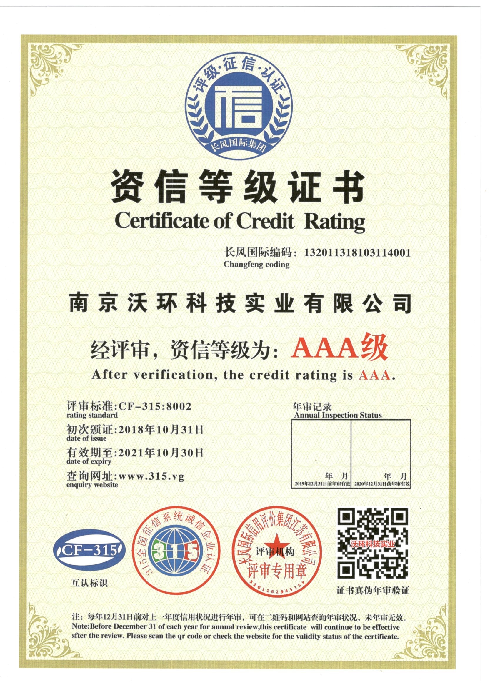 熱烈祝賀南京沃環(huán)公司被專業(yè)評審機構(gòu)-長風國際集團評為AAA級資信等級